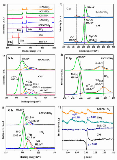 Four binding energies in N 1s spectra (Figure 2c) can be observed, which can be classified into to sp2 hybridized nitrogen C-N=C (398.8 eV), tertiary nitrogen N-(C)3 (399.2 eV), amino functional groups N–H (400.3 eV), and π-excitation (401.2 eV), respectively [36,37,38]. The C 1s and N 1s spectra are slightly shifted from primitive g-C3N4 which suggests that there is a chemical bond connection between g-C3N4 and TiO2 [39]. The C/N ratio of g-C3N4 is 0.90, indicating the presence of nitrogen vacancies that probably occurred during the thermal reduction process [40]. EPR spectra can provide evidence for probing the surface vacancies in photocatalysts. As shown in Figure 2f, the EPR intensity signal of CNS is significantly enhanced, revealing the increase of nitrogen vacancies generated in gC3N4 [41]. Figure 2d shows the high-resolution Ti 2p spectrum. The binding energy peaks of Ti 2p3/2 and Ti 2p1/2 appeared at 459.3 and 465.0 eV, which represent Ti4+ species in the form of TiO2 clusters [42]. In addition, there might be another Ti species in the material due to the poor XPS peak fitting for the Ti4+ alone. A better XPS profile fitting was later obtained by including a peak at 460.2 eV, being assigned as the Ti3+ defects on the composite surface [43,44]. The O 1s spectrum in Figure 2e can be devised into three peaks in TiO2 with the binding energy of 530.5, 531.9, and 533.2 eV which can be assigned to (Ti-O), oxygen vacancy (Vo), and water molecules adsorbed on the surface of TiO2, respectively [45]. Figure 2f shows the result of the solid ESR measurement which was used to confirm the presence of Ti3+. A strong EPR signal of TiO2 and the composites was observed with g of 1.997, which corresponds with Ti3+ defect (3d1, S = 1/2) and oxygen vacancy (Vo) [46]. It is possible that Ti4+ was reduced to Ti3+ by the loss of oxygen from the surface of TiO2 because of the hydrothermal treatment at a high temperature [47].