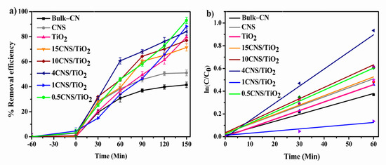 The photocatalytic performance of g-C3N4, TiO2, and composites was evaluated for IMI degradation under UV-Vis light irradiation in Figure 5. Photolysis of IMI degradation was carried out under the same conditions, as can be seen from Figure S2. It was found that the photolysis is not the main cause of effective degradation of IMI. On the other hand, the treatments of IMI with catalysts are less effective in dark conditions. From this result, the g-C3N4 system exhibited low photocatalytic efficiency in the degradation of IMI. This could be because of the fast recombination of electron–hole pairs, as evidenced by PL spectra (Figure 4c). However, it was found that exfoliated g-C3N4 showed higher photocatalytic activity than bulk-g-C3N4. It could be explained as the effects of a larger specific surface area, narrow band gap, and nitrogen defects which improved photogenerated charge separation and transfer [56]. In addition, the incorporation of TiO2 clearly enhances the photocatalytic activity of g-C3N4. Specifically, 0.5CNS/TiO2 and 1CNS/TiO2 exhibited excellent photocatalytic activity, and photocatalysts were able to degrade 93.1% and 88.3% of IMI within 150 min, while pure TiO2 and g-C3N4 only degraded IMI by 79.7% and 51.8%, respectively. It is reasonable that there might have been a synergetic effect between TiO2 and g-C3N4. g-C3N4 can narrow the band gap energy and increase solar absorption efficiency. In addition, Ti3+ and oxygen vacancies (Ov) in TiO2 can suppress the recombination of photogenerated electron–hole pairs and promote charge separation [57] which led to high photocatalytic degradation of IMI. As seen in Figure 4c, CNS gave a very broad PL spectrum having a very high intensity. In addition, the PL intensity from 0.5CNS/TiO2 was found just slightly higher than that from the TiO2 material (much weaker than that of CNS). Several works [58,59] related the intensity of PL spectra to the oxidation–reduction potential between the conduction band and the valence band. PL spectra with lower intensity described a low probability of photogenerated electron–hole recombination. Although PL results suggest a slightly faster recombination rate on the 0.5CNS/TiO2, its relatively narrow band gap (compared with TiO2) promoted superior IMI removal efficiencies (Figure 5). It should be noted that the loading level of g-C3N4 played an important role in improving the IMI photodegradation. It was found that the photocatalytic rate of activity slightly decreased after 90 min irradiation time when the loading of g-C3N4 was increased from 4% to 15%. This might be due to the fast recombination of the electron–hole pair in g-C3N4. Furthermore, from Figure 5, 0.5CNS/TiO2 gave a higher IMI degradation rate than that of 1CNS/TiO2, as seen from the slope. However, the IMI removal efficiencies obtained from the 4CNS/TiO2 treatment were higher during 0–120 min. Effective photodegradation of organic compounds requires a suitable amount of stable radical species in the aqueous media. Too-high concentrations of radical species may cause termination of the radical reaction pathway, while insufficient radical concentrations resulted in slow degradation rates and low removal efficiencies. We could explain the removal efficiencies by the varied concentrations of radicals over time. Hence, after 150 min, three samples (i.e., 0.5CNS/TiO2, 1CNS/TiO2, and TiO2) gave % IMI removal efficiencies of 80% and above, likely due to the suitable amount of stable radical species in the aqueous media through the prolonged degradation process.