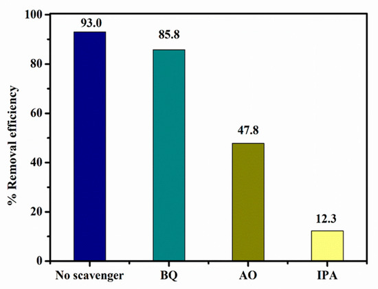 Active species capture experiments were used to study the photocatalysis mechanism. First, isopropyl alcohol (IPA; 0.5 mM) was used as the hydroxyl scavenger (•OH˙), benzoquinone (BQ; 0.5 mM) was employed as the superoxide scavenger (•O2−), and ammonium oxalate (AO; 0.5 mM) was used as the hole scavenger (h+) [70]. Different scavengers were used in the trapping experiments to check the inhibitory effect of scavengers during the photocatalytic reaction under analogous irradiation experimental conditions.