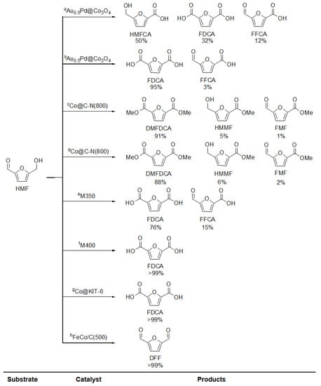 Fang et al. [116] have also reported the synthesis of FeCo/C bimetallic catalysts, used in the aerobic oxidation reaction of HMF to obtain DFF. In this case, the FeCo/C catalysts were obtained from MIL-45b MOF by thermolysis at 500, 600, 700 and 800 °C, with a heating rate of 1 °C min−1 for 6 h. These were named FeCo/C(T), where T represents the calcination temperature. The studies indicate that the best catalyst was FeCo/C(500), with which conversion and selectivity of >99% to the DFF product were obtained. The good results were attributed to the fact that the hollow structure of the FeCo/C(500) catalyst promotes the adsorption of HMF, as well as the rapid desorption of the formed DFF, leading to a higher product yield. The catalysts obtained at higher temperatures, i.e., 600, 700 and 800, did not present the same properties since the pores collapsed due to the effect of the temperature. This highlights that thermal control in the synthesis of the catalyst is a relevant parameter. The summary of the reactions and its catalytic results are shown in the Figure 5 and Table 4.