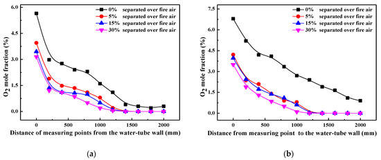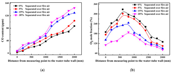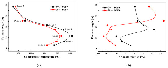 To avoid the possibility of being oxidized and to achieve the best NOx reduction performance, the reducing species (pyrolysis gas and ammonia solution) should be injected into the furnace under high-temperature and reducing atmosphere [24,25]. Therefore, influences of SOFA ratio on in-furnace combustion atmosphere are firstly studied, and Figure 1 presents the profiles of combustion temperature and O2 mole fraction under various SOFA ratio combustion scenarios. It should be noted that data points in Figure 1 are the average parameter values measured at each certain furnace height. It can be told that temperature distribution patterns are very similar in 0% and 30% SOFA ratio cases, where combustion temperature is very low at the furnace bottom and then is increased evidently in the primary combustion zone due to the intense combustion process. With the continuous increase of furnace height, the share and intensity of the coal combustion process decrease, so that the continuous heat absorption of water-tube walls leads to a gradual decrease of temperature level. In consistent with combustion temperature, oxygen content is lowest in the primary combustion zone because of its consumption and then increases in the SOFA zone due to the input of SOFA air and the decreased coal combustion intensity.