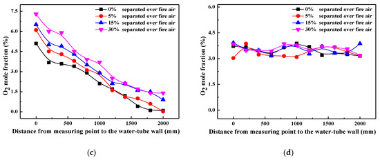 In order to characterize the influence of air staging on combustion atmosphere in detail, oxygen mole fractions along the axis of reducing agent injectors are measured at each measuring point height, and their values are illustrated in Figure 2. For simplification, only oxygen content measured from point 2 (primary combustion zone), point 4 (reducing zone), point 6 (SOFA zone), and point 7 (furnace exit) are plotted in this work. It can be found that with the SOFA ratio increasing, oxygen content in the near-wall region decreases evidently in the primary combustion zone and reducing zone, and oxygen content differences among various SOFA ratio cases decrease with the increase of furnace depth. This demonstrates that the introduction of SOFA can reduce the oxidizing atmosphere in the near-wall region, which thus creates a larger reducing area inside the furnace. On the contrary, since more oxygen is introduced into the furnace from the SOFA region, oxygen content in the SOFA region (point 6) increases gradually when the SOFA ratio is increased, which guarantees the continued combustion of incompletely burned coal particles. Considering the fluctuation of measured data over time, it can be reckoned from Figure 2d that there are no essential differences in oxygen contents at the furnace exit under various SOFA ratio cases. That is to say, 30% SOFA ratio helps to create a large reducing area below the SOFA region to promote NOx reduction when reducing agents are injected, and coal combustion efficiency will not be obviously decreased at the same time.