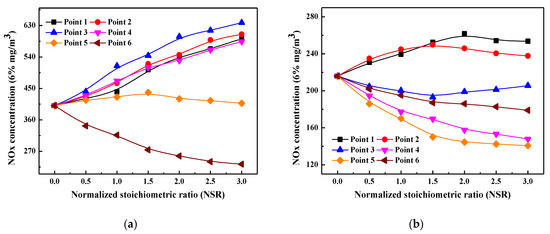 It can be seen from Figure 4a that without air staging, the furnace exit NOx emission increases when ammonia solution is injected into the furnace from points 1–4. Figure 1b shows that oxygen content in the area between measuring points 1 to 4 is all higher than 1.0%, and it is as high as 3.1% at point 4. Meanwhile, except for point 1, the average temperature in this region falls in the range of 1180–1310 °C. In other words, the region between point 1 and point 4 is in a high-temperature and oxidizing atmosphere when SOFA is not adopted, so the injected ammonia solution is more likely to be oxidized to NOx instead of reacting with the generated NOx. Therefore, the furnace exit NOx emission increases after ammonia solution injection and the increased NSR value further promotes its oxidization. When ammonia solution is injected from point 5, NOx emission increases slightly and then decreases slowly with the continuous increase of NSR. This is attributed to that combustion temperature and oxygen content are still high here, so the injected ammonia solution is more likely to be oxidized when NSR is slightly increased, and thus NOx emission increases. However, when NSR is largely increased, the amount of injected ammonia solution increases evidently and part of the un-oxidized ammonia solution rises upwardly with the flue gas, which enters the region that falls within the temperature window of SNCR and then reacts with the generated NOx. Therefore, NOx emission decreases slightly when NSR exceeds 1.5. Since the further decreased temperature at point 6 makes it suitable for the SNCR denitrification process, the injected ammonia solution is not likely to be oxidized but more involved in NH3/NO reduction process. Therefore, NOx emission decreases with the increase of NSR when ammonia solution is injected from point 6. However, it should be noted that point 6 is very close to the furnace exit, so the reaction time for NH3/NO is insufficient and may result in high content of NH3 slip.