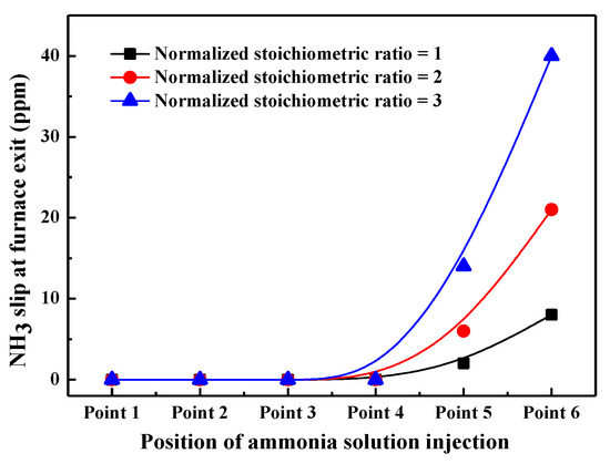 The above results show that the denitrification effects of ammonia solution vary with its injection position, and NOx emission can be further reduced on the basis of deep air staging if ammonia solution is injected through appropriate locations (points 4–5). Besides, NOx reduction efficiency is increased with the increase in amount of ammonia solution (NSR). However, NH3 slip from the furnace may result in secondary air pollution and severe corrosion problem on the rear heating surfaces in practical boiler. To avoid this, NH3 slip at the furnace exit is measured when ammonia solution is injected into the furnace, as shown in Figure 5.