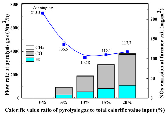 - Injecting the pyrolysis gas consisting of CO, CH4 and H2 is conducive to reducing NOx emission at the furnace exit. When the calorific value of pyrolysis gas accounts for 10% of the total heat input into the furnace, NOx reduction efficiency reaches its maximum, and NOx emission is reduced to 102.8 mg/m3.