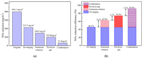 - The technologies of deep air staging and injections of ammonia solution and pyrolysis gas can synergistically reduce NOx emission, where NOx emission is reduced to 31.9 mg/m3 and the combined NOx reduction efficiency is as high as 92.0% under optimal conditions.
