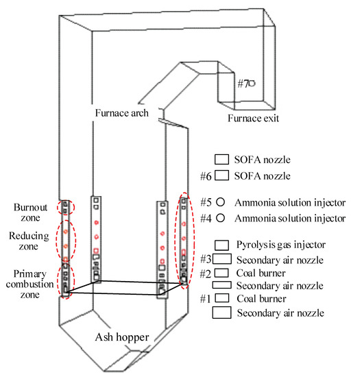 Although many studies have proved that adding reducing agents into the combustion region or NOx-containing flue gas can effectively reduce the final NOx emission, these studies are mainly based on laboratory-scale test facilities or pure mechanism analysis. Since the in-furnace aerodynamics and coal combustion behavior are more complicated in practical pulverized coal boilers, the local combustion atmosphere and the mixing degree of reducing agent and generated NOx are quite different from that in lab-scale test rigs. Therefore, the applicability of theoretical analysis and lab-scale experimental results to the complicated combustion conditions in practical boilers needs to be further investigated. Besides, due to the greatly varied combustion conditions inside the pulverized coal boiler furnace, the optimal injection position and amount of reducing agents should also be further confirmed.