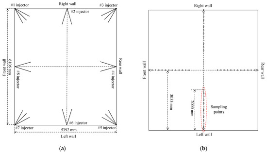 Arrangement scheme of nozzles for pyrolysis gas and ammonia solution injection (a) and distribution of measuring points (b).