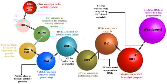 A brief timeline for the use of clay minerals as catalyst and in particular on the application of halloysite nanotubes (HNTs).