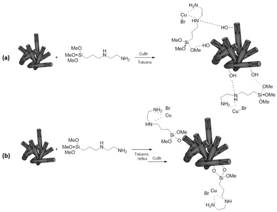 (a) Physisorption of CuBr/silane catalyst onto HNTs; (b) modification of HNTs surface by silane groups before to formation of the catalyst. Adapted with permission from ref. [46]. Copyright 2011 Elsevier.