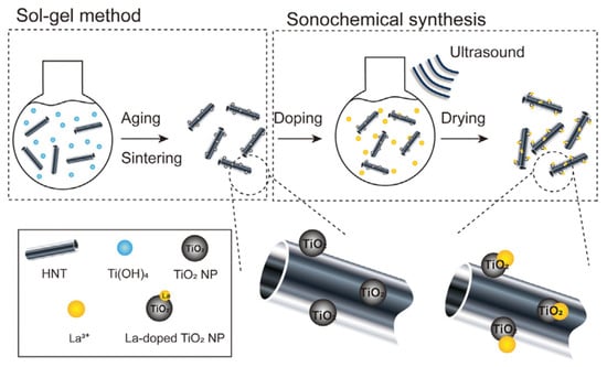 Recently, to improve the photocatalytic properties of TiO2 NPs, Lee et al. synthetized a La3+ doped TiO2 on HNTs (La/TiO2@HNTs) catalyst by a two steps procedure based on a sol-gel process followed by a sonochemical method [79]. First, the authors synthetized TiO2 NPs by a low-temperature sol–gel process using titanium(IV) isopropoxide precursor supported on the HNTs surface. Then, the immobilized TiO2 NPs were doped with lanthanum nitrate hexahydrate precursor in a sonochemical method (Figure 5).