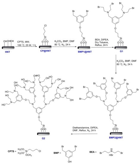 Schematic representation of the dendrimers supported onto HNTs. Reproduced with permission from ref. [95]. Copyright 2020 John Wiley and Sons.