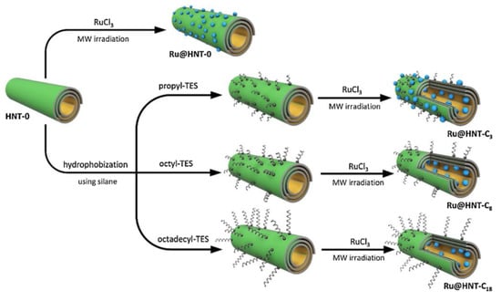 A step-forward to the use of HNTs as support for Ru NPs was made some years later by the same authors, who proposed the development of catalytic core-shell nanoreactors based on hydrophobized HNTs to stabilize the metal NPs [97]. To achieve this goal, they modified the external HNTs surface with three different alkyltriethoxysilanes, namely the ones with the tail length of C3, C8 and C18. By adopting this strategy, a hydrophobic shell was created onto the HNTs outer surface to avoid the adsorption of Ru3+ ions onto the negatively charged HNTs external surface and forces them into the hydrophilic lumens (Figure 9). Contact angle measurements showed an increase in the θ value by increasing the alkyl length of the silane. Thanks to the hydrophobic shell, the Ru NPs were formed preferentially inside the tubes, resulting in the formation of stable, active and recyclable catalytic system. As for an example, the longer the silane alkyl chains shell (C18), the more complete is the Ru loading (2.7 wt% Ru vs. 3.0 theoretical value) in the final nanocatalyst. This was confirmed by TPR-H2 measurements and TEM images, which also allowed to esteem a mean size of 4.6–5.0 nm in diameter.