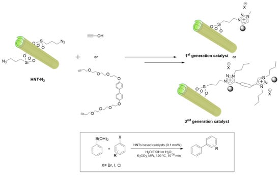 - Massaro, M.; Riela, S.; Cavallaro, G.; Colletti, C.; Milioto, S.; Noto, R.; Parisi, F.; Lazzara, G. Palladium supported on Halloysite-triazolium salts as catalyst for ligand free Suzuki cross-coupling in water under microwave irradiation. J. Mol. Catal. A Chem. 2015, 408, 12–19. [Google Scholar] [CrossRef]