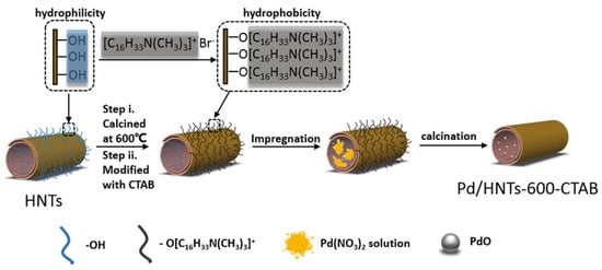 - Li, W.-J.; Wey, M.-Y. Core-shell design and well-dispersed Pd particles for three-way catalysis: Effect of halloysite nanotubes functionalized with Schiff base. Sci. Total Environ. 2019, 675, 397–407. [Google Scholar] [CrossRef] [PubMed]