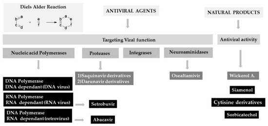 With recent and continuous outbreaks of SARS-CoV-2, responsible for the COVID-19 pandemic, it became obvious that the research in the antiviral field needed to be developed and encouraged. This review describes a variety of DARs aimed at obtaining optically active intermediates that are useful for the synthesis of antiviral agents exploiting several catalytic conditions. The DAR can be defined as a [4 + 2] cycloaddition in which a conjugate diene reacts with a dienophile to form an adduct endowing six membered ring with the formation of two new σ bonds, starting from two π bonds [2,3] (Scheme 1).