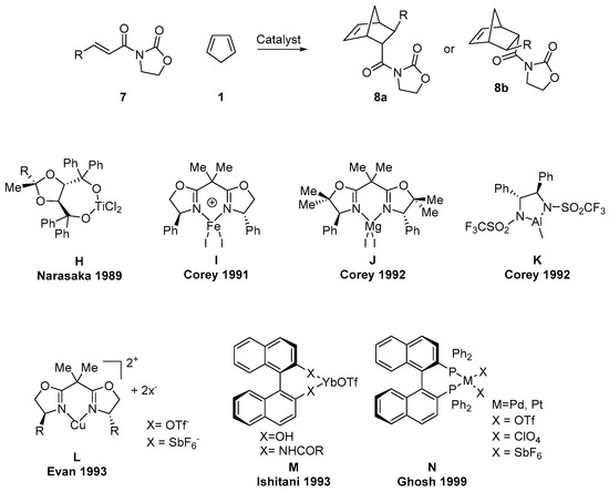Since the first successful application of a chiral LA to the DAR between dienophile 7 and cyclopentadiene 1 (Scheme 4) that was achieved from Narasaka with Ti(IV) catalyst (TADDOL-based, H, Scheme 4) and promoted DA in over 90% ee [34], many research groups have been widely investigated this reaction. These latter ones allowed for the discovery of many complexes derived from of metals (Fe(III), Mg(II), Ti(IV), Yb(III), Zr-(IV), Al(III), Ni(II) and Cu(II)) and chiral ligands able to afford the DA adduct counterpart with excellent ee. Corey and co-workers reported catalysts derived from bis-(oxazoline) (box) complexes of Fe(III) (I, Scheme 4), speculating that the reaction between 7 and 1, using 10 mol%, proceeded with 90:l0 enantioselectivity to give the endo adduct preferentially (endo:exo ratio 97:3) [35].