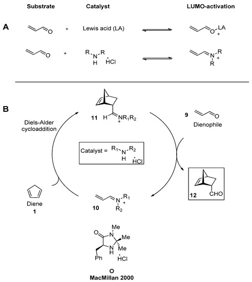 (A) LUMO activation obtained using the LA compared with a carbogenic system (iminium ions from alfa, beta unsaturated aldehyde and amine). (B) Organocatalyzed DA reaction between cinnamaldehyde 9 and cyclopentadiene 1.