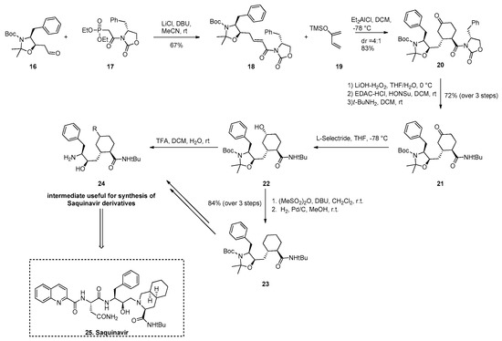Saquinavir, discovered by Hoffman–La Roche in 1988 and approved by the FDA in 1995, is the first HIV protease inhibitor (PI) for the treatment of AIDS. As reviewed from Ghosh et al., several approaches for its synthesis have been developed [55]. However, the reported synthesis does not allow easy substitution of the carbocyclic ring, which represents a crucial region that could potentially lead to enhanced potency and better pharmacokinetic properties of inhibitors. Herein we present an approach published from Cracket and collaborators in 2004 [56]. They developed a versatile chiral DA route based on chiral auxiliary to a range of carbocyclic mimetics of scissile Phe-Pro. As described in Scheme 7, the chiral dienophile 18, which was obtained by coupling aldehyde 16 and phosphonate 17 [57] under Masamune–Roush conditions [58], reacts with the 2-(trimethylsilyloxy)-1,3-butadiene 19 under LA catalysis (Et2AlCl), affording a 4:1 mixture of diastereomeric trans-diketones 20 in 83% yield. The required trans isomer, easily separable from the cis, was subjected to reaction by means of LiOH/H2O2 and then affording the required tert-butylamide 21 via the N-hydroxysuccinimide ester. The equatorial alcohol 22 was obtained by using L-selectride in excellent yields and selectivity. It also could be readily converted to a range of ethers by treatment with NaH in DMF at 0 °C and the corresponding alkyl halide. The equatorial alcohol 22 could also be converted to the saturated carbocycle 23 by transformation to the mesylate, elimination and reduction. Further transformations of 22 and 23, in particular, the removal of N-Boc and acetonide-protecting groups in presence ofdichloromethane/TFA containing a few drops of H2O gave amines 24 suitable for further elaboration of HIV protease inhibitors.