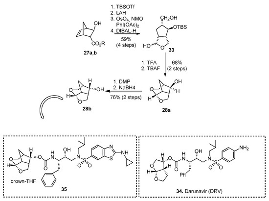 Even if DRV is highly active against multidrug-resistant HIV-1 variants with a dual mechanism of action, as it potently inhibits biologically active dimeric HIV-1 protease and prevents dimerization of protease monomers [59,60], DRV-resistant and HIV-1 variants may result in treatment failure [61,62]. Recently, Ghosh et al. reported the design and synthesis of a new class of PIs incorporating a 6-5-5 ring-fused crown-like tetrahydropyrano-tetrahydrofuran (crown-THF) as the P2 ligand with a hydroxyethyl sulfonamide transition-state mimic (28b, Scheme 8) [63,64].