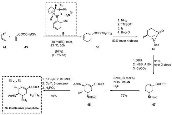 In 2006, Corey reported an elegant synthesis of Oseltamivir phosphate 36 [74] based on key catalytic asymmetric DAR between butadiene 44 and trifluoroethylacrilate 45 in the presence of 10% triflimide-activated oxazaborolidine catalyst E, affording the DAR counterpart 38 with excellent yield and ee (97% yield, >97% ee). The high enantioselectivity was explained by a transition state model, in which butadiene approached the activated dienophile from the Re-face opposite the shielding phenyl group of the catalyst. Remarkably, the initial DAR step is easily carried out at room temperature on a multigram scale with recovery of correspondent precatalyst. The next reactions in the sequence involved (a) ammonolysis of 38 and (b) Iodolactamization, using the Knapp protocol [74], and N-Boc insertion afforded derivative 46. Then (a) dehydroiodination with 1,8-diazabicyclo-[5.4.0]undec-7-ene (DBU), (b) allylical bromination and (c) treatment with cesium carbonate in ethanol afforded the diene ethyl ester 47. The next step in the synthetic sequence was a SnBr4-catalyzed bromoacetamidation completely regio and stereoselective, using N-bromoacetamide (NBA), that converted the diene 47 to the bromodiamide 48, and, in turn cyclized it to the N-acetylaziridine counterpart, which, after treatment with 3-pentanol solution containing a catalytic amount of cupric triflate, removal of the Boc group and salt formation with phosphoric acid in ethanol afforded 36 (Scheme 12).