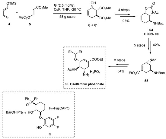 Shibasaki [30] proposed the synthesis of Oseltamivir phosphate based on chiral DAR adduct between diene 4 and methyl fumarate 5, performed in a big scale (58 g), catalyzed from F2-FujiCAPO and Ba(OiPr)2 (G, Scheme 3), affording DA adducts 6,6′ with high enantioselectivity (96% ee) in the presence of CsF as additive. The (exo-6′ isomer) decomposed during the next transformations, which allowed us to obtain the cyclic carbamate 54 in 93% of yield after four steps (96% ee); further recrystallized from CH2Cl2/cyclopenthyl methyl ether increased the ee up to 99%. Moreover, 54 was converted into N-acyl aziridine 55 in five steps (42%), and the subsequent aziridine opening performed best by using BF3·OEt2 to afford Boc-protected (-)-Oseltamivir. Cleavage of the Boc group with TFA and salt formation with phosphoric acid produced Tamiflu (36 in 73% yield) (Scheme 14).