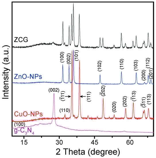 XRD spectra of the (a) g-C3N4, (b) CuO-NPs, (c) ZnO-NPs, and (d) ZCG nanocomposite.