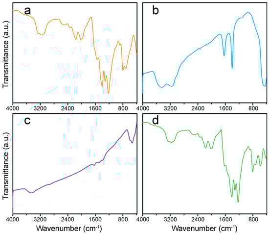 FTIR spectra of the (a) g-C3N4, (b) ZnO-NPs, (c) CuO-NPs, and (d) ZCG nanocomposite.