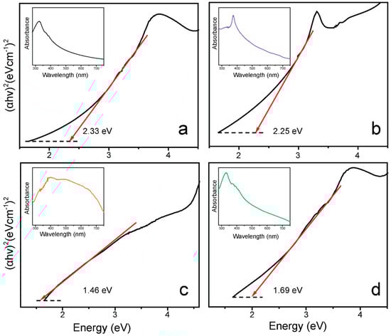 Tauc plots of the (a) g-C3N4, (b) ZnO-NPs, (c) CuO-NPs, and (d) ZCG nanocomposite. Each inset displays the representative UV–vis absorption data of the compound.