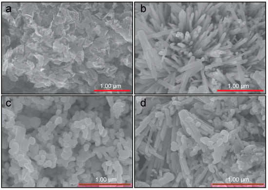 FE-SEM images of the as-synthesized (a) g-C3N4, (b) ZnO-NPs, (c) CuO-NPs, and (d) ZCG nanocomposite.