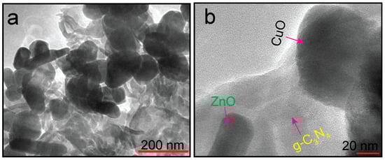 For a better understanding of the heterostructure, we further used high-resolution transmission electron microscopy (HR-TEM) to explain the presence of g-C3N4, ZnO, and CuO nanoparticles in the ZCG composite. Figure 6a,b show the low and high magnification micrographs of the compound. As can be clearly seen from both the figures, the ZCG nanocomposite is constructed by g-C3N4, ZnO, and CuO compounds and their individual morphology is intact after forming the composite. The outcomes are also balanced with the findings of FE-SEM.