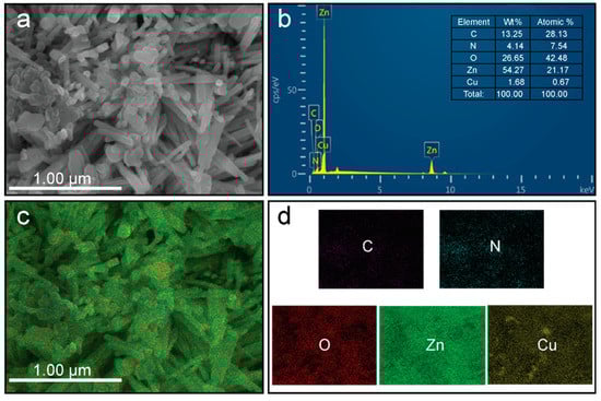 The chemical confirmation and purity of the as-prepared ZCG nanocomposite were analyzed through energy-dispersive X-ray spectroscopy (EDS) and are shown in Figure 7a,b. Figure 7a from the FE-SEM image was used to determine the EDS analysis. The result shows that the five constituent elements Zn, Cu, O, C, and N exist in the composite and their atomic and weight percentages (inset) are indicated in Figure 7b. The prepared nanocomposite is free from impurities due to the absence of additional peaks. These findings are in line with the XRD outcomes. The distribution of the elements in the composite was further inspected using elemental mapping images of the ZCG composite (Figure 7c,d). The outcomes confirm that the Zn, Cu, O, N, and C elements were homogeneously distributed in the nanocomposite.
