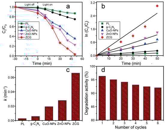 The photodegradation activity of g-C3N4, ZnO-NPs, CuO-NPs, ZCG, and photolysis (PL) was evaluated for the deterioration of MB as a representative organic pollutant under visible light illumination for 50 min. The adsorption ability was also inspected under dark conditions and is displayed in Figure 8a. The results show the adsorption proficiency of the compounds is negligible compared with photodegradation and increase in sequence PL < g-C3N4 < CuO-NPs < ZnO-NPs < ZCG. The photocatalytic activity of the aforementioned materials was calculated through the following Equation (1) []: