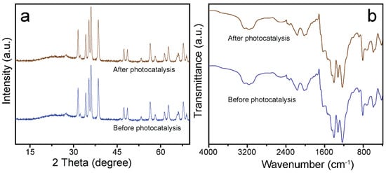 (a) XRD, and (b) FTIR patterns of the ZCG nanocomposite (before, and after photocatalytic analysis).
