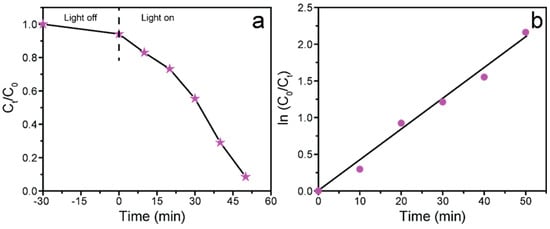 Further, a kinetics study was undertaken to better understand the product’s catalytic activity, as shown in Figure 8b. The linear plots of ln (C0/Ct) vs. illumination time for MB photodegradation show pseudo-first-order reaction kinetics. The deterioration rate constant (k) was calculated employing Equation (2) []: