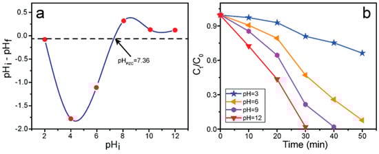 The electrical charge and pH of the catalyst and organic pollutants are vital parameters for understanding photocatalytic efficiency. The pHpzc signifies the charge of the catalyst surface. The pH drift technique was applied to estimate the pHpzc of the as-prepared ZCG composite. The initial pH (pHi) of the solution was adjusted by adding either HCl or NaOH. The final pH (pHf) was then measured. The pHpzc was determined by plotting pHi vs ΔpH (pHf − pHi) and pHpzc refers to the point at which the total numbers of positive and negative charges are identical. The pHpzc of the ZCG nanocomposite was 7.36 (Figure 11a). These outcomes indicate that the ZCG catalyst’s surface is negative at pH values higher than pHpzc and positive at pH values lower than pHpzc. The pH effect of the ZCG composite for the MB deterioration was investigated at different pH values (pH 3, 6, 9, and 12). In addition, the catalyst dose and concentration of the solution in each experiment were identical. The photocatalytic proficiency of the composite was dramatically improved with the increase in the solution’s pH (Figure 11b). The highest activity was achieved at a high pH (12, basic medium) within 30 min due to the strong interaction between the cationic MB dye and the anionic (negatively charged) surface of the catalyst. By contrast, the lowest efficiency was observed at pH 3 because at low pH (acidic medium), the catalyst surface behaves with a cationic nature and therefore repulsion takes place between MB and the catalyst surface.
