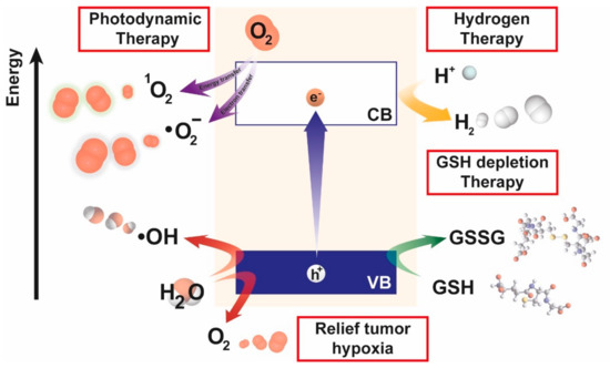 Photocatalytic reactions performed by nanostructured catalysts of interest for cancer therapy. Most of these photocatalysts are reported to produce ROS (i.e., 1O2, •OH and •O2−), but recent works endorse these photocatalysts the capability to generate H2 or O2 through the reaction of aqueous H+ with photogenerated e− and the consumption of photogenerated h+ by H2O molecules, respectively. Moreover, some photocatalysts may also transform intracellular GSH into GSSG via h+ consumption. These reactions are added to the toolbox employed by photocatalysts to achieve a more efficient cancer therapy.
