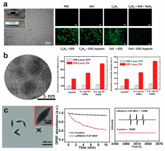 Selection of carbon-based photocatalysts developed for PDT. (a) TEM image of K-doped C3N4 nanoparticles applied for PDT. In vitro experiments demonstrate the K-C3N4 capability of generate O2 and 1O2 simultaneously under 650 nm light irradiation. Reprinted with permission from [21]. Copyright © 2021 Wiley-VCH GmbH; (b) TEM image of N-doped carbon dots and their in vitro photogeneration of peroxide and superoxide species under NIR irradiation. Reprinted with permission from [59]. Copyright © 2019 Wiley-VCHVerlag GmbH&Co. KGaA, Weinheim; (c) TEM image of zirconium-ferriporphyrin metal organic framework (Zr-FeP MOF). Photocatalytic performance of Zr-FeP MOF generating 1O2 demonstrated by DPBF assay and EPR spectroscopy. Reprinted with permission from [63]. Copyright © 2018 WILEY-VCH Verlag GmbH & Co. KGaA, Weinheim.