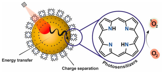 One of the first examples of metal nanoparticles use for 1O2 generation was reported by Kotiaho et al. [81]. Taking advantage of classical organic PS molecules to enhance 1O2 generation, Au NPs were bioconjugated with thiolated phthalocyanines. It was been demonstrated how phthalocyanine-functionalized Au NPs successfully photo-induced charge and energy transfer between the metal surface and the organic bonded macrocycle. They concluded how a selective excitation of the gold cores in the pump−probe experiment results in an energy transfer from the gold nanoparticles to the attached phthalocyanines in ~2.4 ps. Moreover, photoexcitation of the phthalocyanines attached to the functionalized nanoparticles led to an electron transfer to the gold core in ~3.0 ps. Therefore, the energy-donating ability of the gold nanoparticles can be used to extend the absorption range of phthalocyanine, and, at the same time, charge separation between phthalocyanines and gold nanoparticles is achieved (Figure 5).