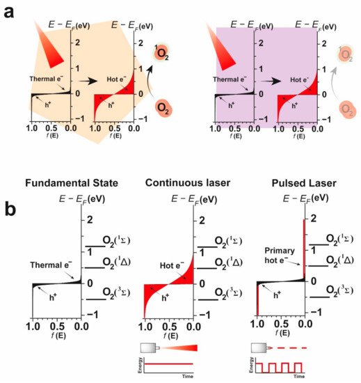 (a) Crystalline-facet dependence in singlet oxygen generation. O2 stabilization in certain surface facet promote an efficient energy transfer between metal crystals and previous chemisorb O2; (b) Schematic illustration of metal-based photo-excitation under visible and NIR excitation wavelengths. Non-irradiated condition with excited thermal electrons, light irradiation and its subsequent response to generate highly energetic primary hot electron/holes followed by electron/holes equilibrium stabilization as a function of the type of laser used.