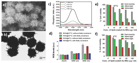 Several examples of gold-based nanoarchitectures with light-induced features to promote PDT and selectively enhance in vitro and in vivo cancer therapy. (a) Scanning electron microscope (SEM) and (b) TEM images for Au NUs; (c) 1O2 phosphorescence emission spectra sensitized by lipid-coated Au NUs at 550, 808, 915, 1064 nm excitation wavelengths; (d) In vitro ROS generation monitored by the mean DCF fluorescence using flow cytometry for lipid-coated Au NUs internalized HeLa cells followed by photo-irradiation with and without NaN3 pretreatment, (e) cell viabilities of lipid-coated Au NUs internalized HeLa cells under dark and photoirradiation at 37 °C and (f) 4 °C. Reprinted with permission from [91]. Copyright © 2014 WILEY-VCH Verlag GmbH & Co. KGaA, Weinheim.