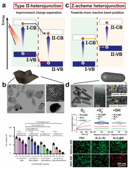 Z-scheme heterostructures are often explored as an alternative to overcome the type-II heterojunction drawbacks. In these structures, both CB (i.e., CBI and CBII) are excited simultaneously (Figure 11c). The e− from CBI are transferred to VBII, leaving stronger reduction/oxidation potentials and thus improving ROS production [112,119,120]. Different Z-scheme configurations have been successfully evaluated for PDT, including Fe2O3-FeS2 [112], SbNSs-THPP (namely, 10,15,20-tetrakis(4-hydroxyphenyl)-21H,12H-porphine) [111], Bi2S3-Bi [113], g-C3N4-Cu3P [114], SnS1.68-WO2.41 [23] or Ni3S2-Cu1.8S [115]. In this case, most of the Z-scheme nanostructures could perform under 808 nm irradiation in comparison with type-II heterostructures, which could work under 650 nm. However, the complexity of biological systems (i.e., different cell lines, tumor models and so on) and the lack of systematic experiments currently prevent a fair comparison among different photocatalysts. Cheng et al. [113] fabricated Bi2S3-Bi Z-scheme with different photocatalytic responses (Figure 11d), including O2, •O2− and •OH generation under 808 nm irradiation. They highlighted the importance of the contact between photocatalysts in the heterostructure (i.e., Bi2S3 and Bi) proving the absence of in vitro and in vivo therapeutic effect when both single-phased materials were introduced simultaneously (Figure 11d). Following the trend found in low Eg photocatalysts and type-II heterostructures, Z-schemes also demonstrate the capability to photooxidize GSH into GSSG, while generating H2 from H+ [23,114]. It has been demonstrated that H2 (Figure 2) targets mitochondria and may induce cell apoptosis through disruption of cellular energy metabolism by hindering ATP production [121,122].