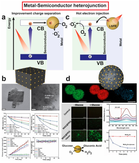 At the interface between metal nanostructures and another media exists a delocalized coherent electron oscillation known as localized surface plasmon resonance (LSPR) [123]. Excitation of these electrons with a suitable wavelength excite them and favors their migration to the CB of the semiconductor, a phenomenon known as “hot-electron injection” [124] (Figure 12c). Li et al. fabricated MoSe2-Au heterostructures with the capability of injecting hot-electrons from Au in the MoSe2 CB under 808 nm irradiation [118]. Apart from enhancing the photocatalytic activity of MoSe2 due hot electron process, Au is a typical catalyst to assist glucose oxidation [125,126]. Removing glucose from tumors interfere in their energy metabolism and has been proved an alternative therapeutic approach [127]. MoSe2-Au photocatalyst effectively produce ROS under NIR irradiation while catalyzes glucose oxidation. This photoactivity exhibited an effective in vivo tumor inhibition (Figure 12d).