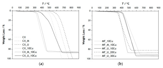 In the original CX there is a loss of mass starting from 440 °C, while in CX_M and CX_U combustion starts at 460 and 520 °C, respectively. Complete combustion of the samples occurs above 600 °C in CX without nitrogen and above 750 °C in CX_M and CX_U. XPS analysis reveals no significant differences regarding the type of nitrogen groups; therefore, the introduction of these groups in the CX, either with melamine or urea as a precursor, gives thermal stability to the materials in an oxidizing atmosphere and the differences are related to the amount of nitrogen present in the materials [33]. Combustion of CX_10Cu, CX_M_10Cu and CX_U_10Cu started at 260 °C, a value considerably lower than that of CX, CX_M and CX_U, while the gradual increase in Cu content led to slighter changes in combustion temperature. These results suggest that there is an interaction between O2 present in the air and copper, leading to a burn of the sample at lower temperatures [34]. MF samples were found to be stable up to 350 °C, suggesting that the structured catalysts were more thermally stable than their powder CX counterparts, with combustion starting at 260 °C [21,25].