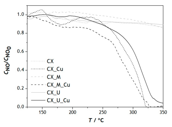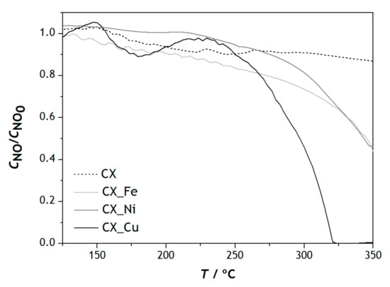 In Figure 3 it can be seen that the CX prepared without metals does not show significant activity in the catalytic reduction of NO up to the maximum temperature used in this study, 350 °C, and the transition metals studied were able to reduce NO into N2 through carbon in the presence of oxygen [11,12]. The CX_Fe and CX_Ni samples showed a maximum conversion of 56 and 54%, respectively, for the maximum reaction temperature, and the sample CX_Cu showed complete conversion at 324 °C. Illán-Gómez et al. [20] studied the catalytic reduction of NOx through transition metals (Fe, Co, Ni and Cu) on a carbon support and the effect of oxygen on catalytic properties of metals at 300 °C, reporting identical values (14, 26 and 44% at 300 °C for Fe, Ni and Cu, respectively), but slightly lower, than those presented in this work. The catalytic activity of the metal for the NO reduction by carbon is affected by the tendency of the metal to be oxidized by NO and by the ease of the resulting metal oxide of being reduced by carbon [20]. Although the largest specific surface area is verified in CX_Fe (628 m2 g−1) and the smallest in CX_Cu (590 m2 g−1), the copper impregnated material exhibited better catalytic performance for NO reduction [14].