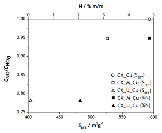 The influence of the specific surface area and the amount of nitrogen was assessed in Figure 5. As all materials have the same amount of copper, samples are more catalytically active the greater the specific surface area and the greater the percentage of nitrogen in the CX [31].