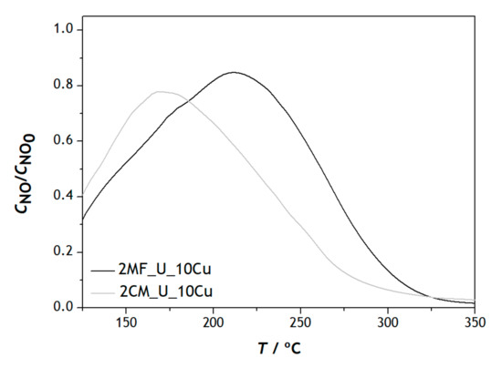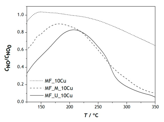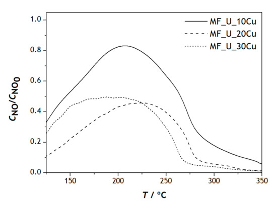 According to the data presented in Figure 7, the temperature required to reach the same NO conversion value decreases with the increasing content of copper in the MF. In MF_U_20Cu and MF_U_30Cu, the NO reduction curves are identical, with a mismatch between them caused at low temperatures by the chemically adsorbed O2 on the surface and at high temperatures due to the better performance in the conversion of NO with the increase in the amount of copper in the sample [38]. This confirms that the presence of Cu is important as the greater the amount of copper in the catalysts the better the catalytic performance for NO reduction.