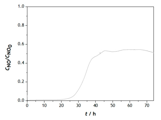 A long-term test was carried out to verify the catalyst stability. Figure 9 shows the NO conversion profile obtained during 75 h at 300 °C for sample MF_U_30Cu.