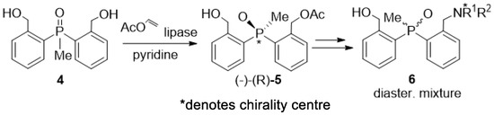 Among the commonly used catalysts, there is a substantial number of hetero-organic compounds, especially organic phosphorus and sulfur compounds. Concerning the former ones, there are mainly phosphines and phosphine oxides [2], whose synthesis requires the application of various methodologies. Among them, the desymmetrisation of prochiral phosphorus substrates seems particularly interesting. Such transformations were performed mainly in a chemical manner, using chiral catalysts (for some recent results see [3,4]). There are only a few examples of the use of enzymes as catalysts, such as desymmetrisation [5,6,7,8], three of which came from our laboratory [5,7,8] (vide infra).