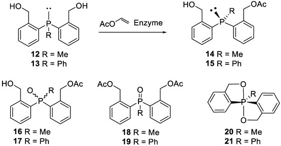 To a solution of the prochiral phosphine diol (12 or 13, 0.1 mmol) or prochiral P-sulfide diol (22 or 23, 0.1 mmol) in a solvent (5 mL) pyridine (3 eq., 0.024 mL, 0.3 mmol), vinyl acetate (0.5 mL) and an enzyme (20 mg) were added. In the case of phosphines 12 and 13, the reaction was carried out under a nitrogen atmosphere. The whole mixture was stirred at room temperature. The conversion degree was determined by 31P NMR. Then, the enzyme was filtered off and the solvents were evaporated. The crude reaction mixture was separated by column chromatography using dichloromethane-acetone in gradient from 100:1 to 1:1 with the addition of triethylamine (0.03% vol.) as eluent, to give pure enantiomerically enriched phosphine monoacetates 14 and 15 and P-sulfide monoacetates 24 and 25. The results are collected in Table 1 for phosphines 12 and 13 and in Table 2 for sulfides 22 and 23.